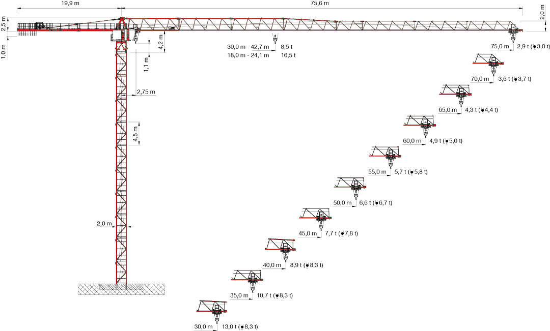 Grundausleger 30 m mit Katzfahrwerk. Verlängerung bis 75 m in 2,5 m Schritten. Drehrahmen mit zwei Drehwerken, Drehverbindung mit Zentralschmierung und Schleifringsystem, Führerhausstation mit Schaltschrank. Gegenausleger mit Hubwindenplattform und Gegengewichten.