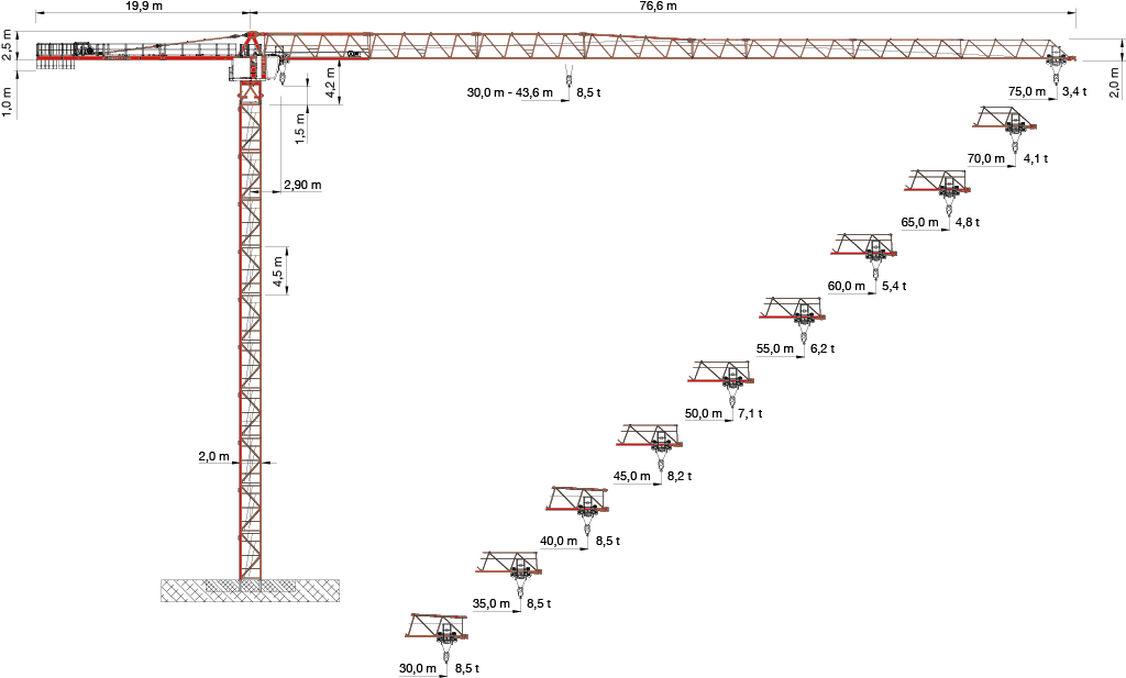 30 m basic jib with trolley gear. Extensions up to 75 m radius in 2.5 m steps. Slewing frame with two slewing gears, slew bearing with central lubrication unit and slipring system, operator cabin station with control cabinet. Counterjib with hoisting platform and counterweights.